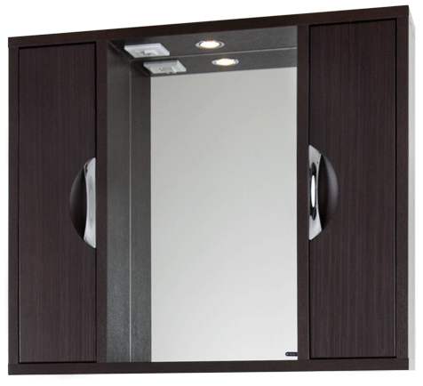 Комплектация: влагостойкая зеркальная панель с открытой полочкой, два боковых шкафчик с распашными дверцами, галогеновый светильник, розетка для фена или бритвы.