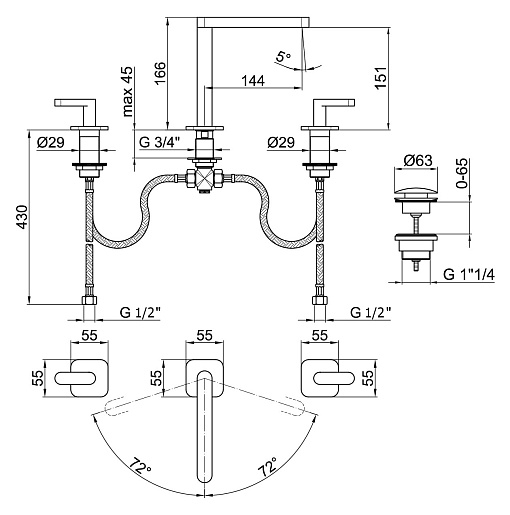 - донный клапан: G 1 1/4 click-clack (управление с помощью пробки)