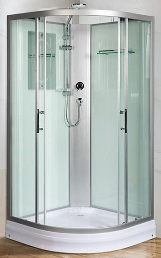 Дверцы из стёкол в 5 мм толщиной плавно ходят на двойных металлических роликах. Устройство кабины предусматривает установку сиденья по желанию покупателя. Высота акрилового поддона – 16 см, есть съёмный экран. В сливе установлена сетка-уловитель волос, сифон имеет встроенный металлический клапан и гидрозатвор.- безсиликоновая сборка