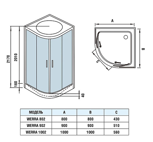 WERRA 802 – просторная душевая кабина, обеспечивающая максимум пространства благодаря габаритам 80х80х217 сантиметров. При стандартной форме в виде четверти круга возможность установки становится простой даже в стеснённых условиях ванных малой площадности.