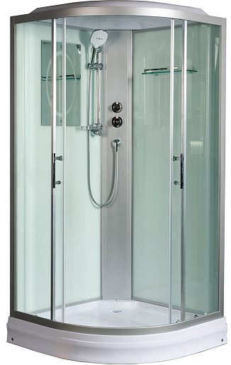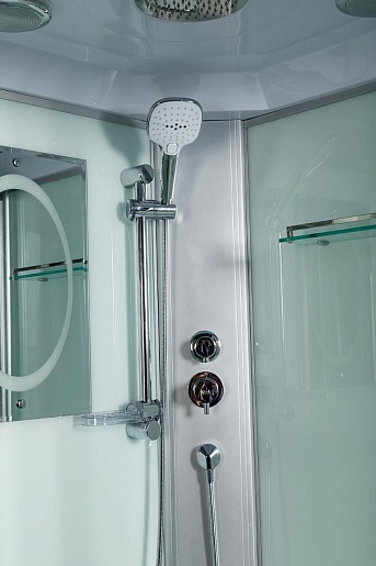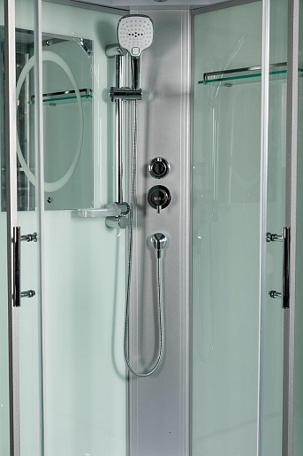 В кабине присутствует возможность переключения трёх режимов ручного душа, имеется верхний душ с функцией очистки Easy Clean, препятствующей образованию подтёков. Длина растягивающегося шланга составляет 150-190 сантиметров. В кабине установлены полочка, привлекательное зеркало с рамкой и фацетом, штанга-мыльница. Также в конструкцию включена сетка-уловитель для волос. Высота акрилового подъёма со съёмным экраном – 16 см.- безсиликоновая сборка