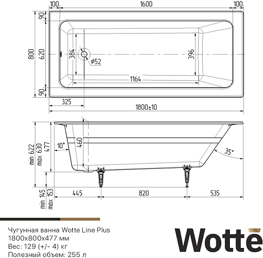 Wotte Ванна чугунная Line Plus 180х80