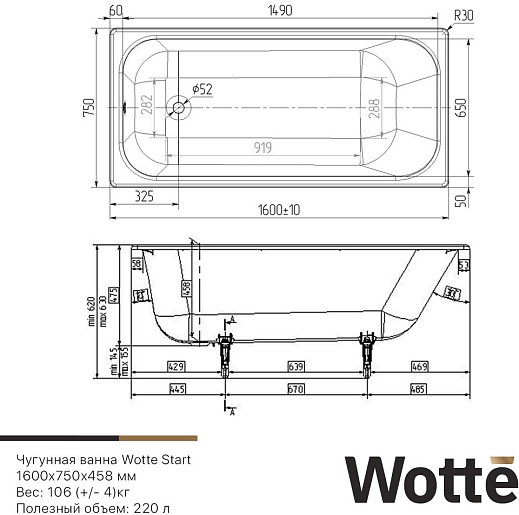 Wotte Ванна чугунная Start 160х75 c отверстиями для ручек