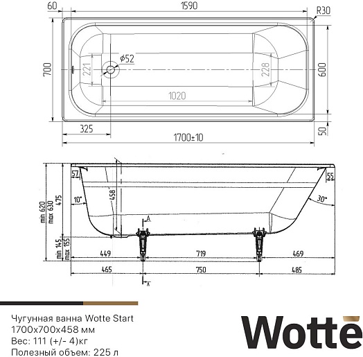 Wotte Ванна чугунная Start 170х70 c отверстиями для ручек