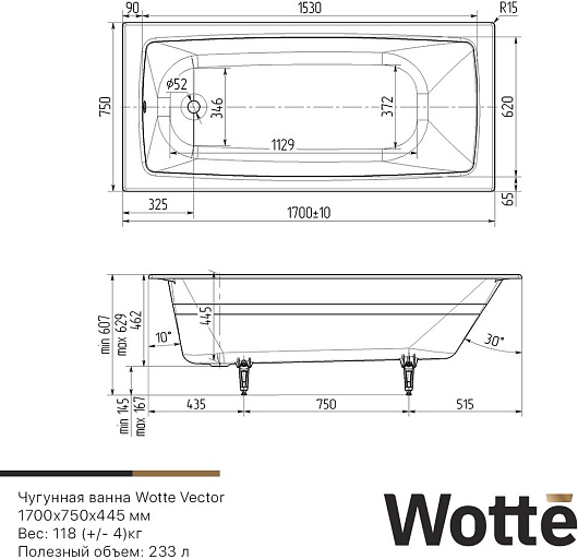 Ванна чугунная Wotte Vector 170х75 - арт. Vector 1700x750.
