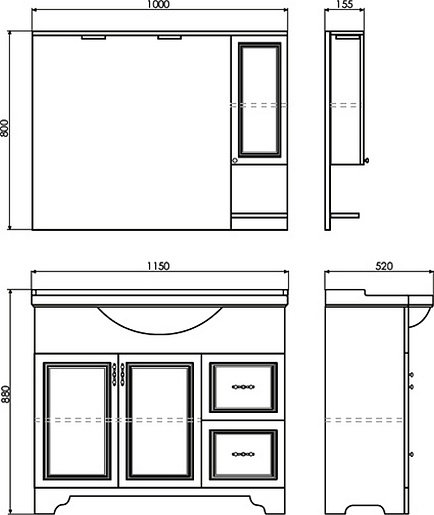 - Размер (ШxВxГ): 1000x800x155 мм.