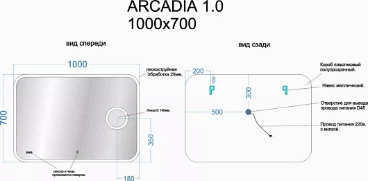 - Дополнительное оснащение зеркала: регулируемая подсветка / датчик температуры воздуха / подвесы.