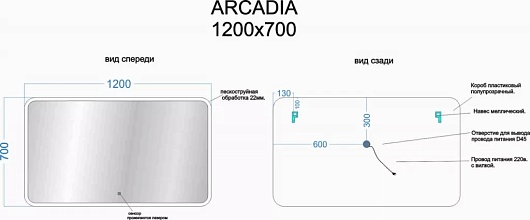 - Дополнительное оснащение зеркала: регулируемая подсветка / подвесы.