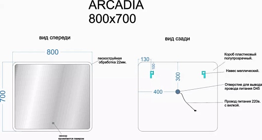 - Дополнительное оснащение зеркала: регулируемая подсветка / подвесы.