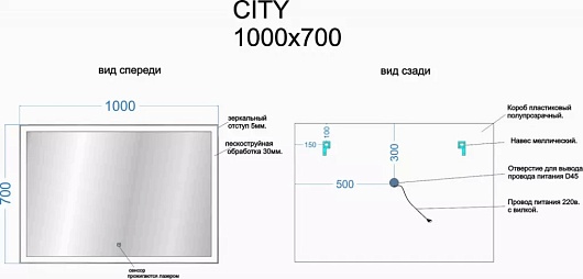 - Дополнительное оснащение зеркала: регулируемая подсветка / подвесы.